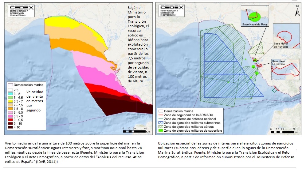 El Ministerio para la Transición Ecológica reconoce explícitamente que “gran parte de la Demarcación suratlántica registra intensidades de recurso que podrían ser de interés para el sector eólico (...), particularmente gran parte de la franja marítima cercana al Estrecho, que se halla bajo la influencia de los frentes atlánticos y que presenta máximos en su vértice sureste”, pero en esa zona –expone– la fuerte actividad militar impide todo desarrollo eólico marino: “tras un proceso de consulta a las administraciones competentes, incluido el Ministerio de Defensa, se concluye que la implantación de parques eólicos comerciales no es factible en esta demarcación marina” (porque Defensa desarrolla en la zona ejercicios militares aéreos, submarinos y de superficie). En fin, muchos miles de kilómetros cuadrados de gran recurso eólico que quedan así –por mor de la defensa nacional– vedados a la energía eólica marina.