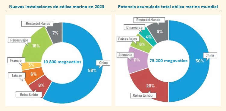En términos de potencia acumulada, China ya había superado al Reino Unido en 2021 como primer mercado del mundo de la eólica marina, tendencia que se mantiene hoy en día. Alemania, Países Bajos y Dinamarca son los otros tres mercados que conforman los cinco primeros.