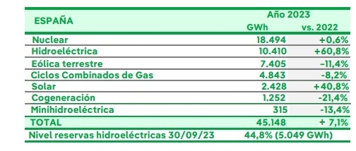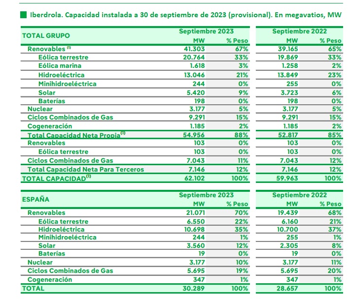 Así, y coincidiendo con la publicación por parte de la CNMV del susodicho Balance Energético (a 9 meses vista), Iberdrola ha difundido un comunicado en el que hace repaso de sus últimos 12 meses. Según los números publicados en ese repaso, el grupo energético ha alcanzado los 41.303 megavatios de potencia renovable instalada a 30 de septiembre, lo que supone un crecimiento de su parque renovable de generación del 5,5% en el último año. Más concretamente, en los últimos doce meses, la compañía ha instalado (dato Iberdrola) 2.952 MW de potencia renovable, lo que le ha permitido incrementar su cuota de electricidad limpia en un 1,5% sobre el total de su generación con respecto al año pasado (el año pasado el 45,3% de su producción fue de origen renovable; este año lo ha sido el 46,8). Así, la compañía "continúa a paso firme -presume en su comunicado- con su compromiso por liderar la revolución energética" (a 30 de septiembre de 2023, Iberdrola ha generado con fuentes renovables, en estos nueve primeros meses de año, concretamente 58.742 gigavatios hora, es decir, menos de la mitad de los 125.345 GWh que ha generado en total -con uranio y combustibles fósiles- a escala global, según especifica el Balance que ha publicado la CNMV).