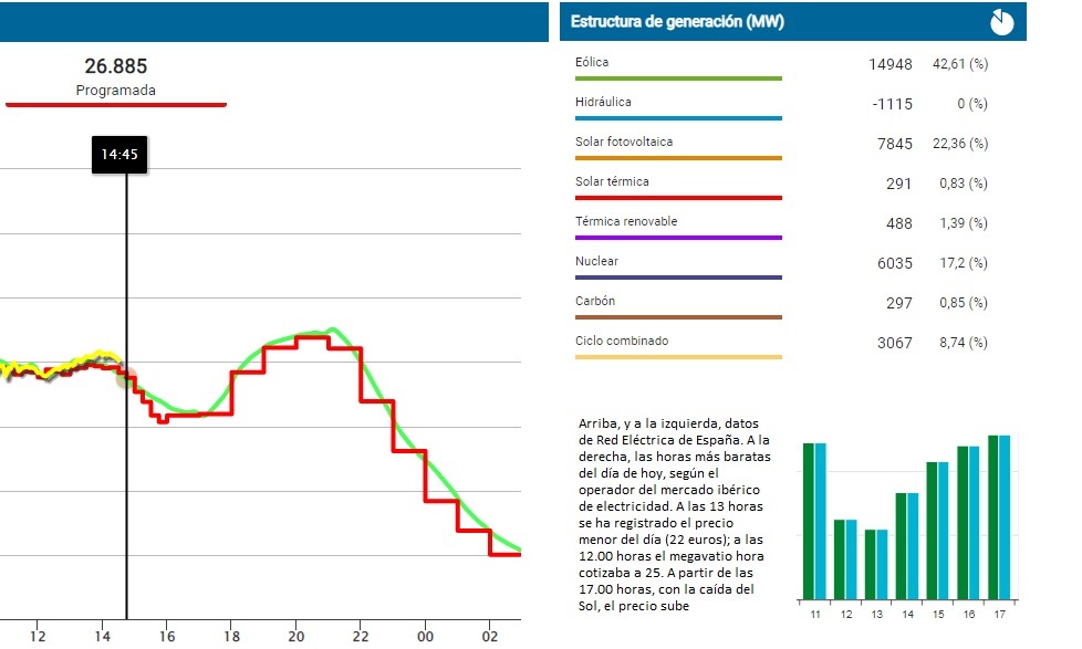 Cero aportación hidráulica, pero gran generación eólica y fotovoltaica. Según el operador del sistema eléctrico nacional, REE, ahora mismo (14.45 horas) la demanda de España está siendo atendida en más de dos tercios (casi un 70%) por el Sol y los vientos. En congruencia, el megavatio hora en el mercado mayorista registra precios muy por debajo de los habituales en estos últimos meses. Según OMIE (el operador del mercado ibérico de electricidad), las horas más baratas del día de hoy están sonando ahora, entre las 12.00 y las 16.00, para alegría de los consumidores. A estas horas el megavatio hora no alcanza ni los 50 euros en el mercado mayorista. La hora más barata ha sonado a las 13.00, con 22 euros. Las responsables, las energías renovables, que han llegado a atender en ese lapso hasta casi el 70% de la demanda de toda España. A las 14.45 horas (véase abajo), más del 67%. A estas horas (14.45), cero hidráulica: las hidroeléctricas cierran el grifo cuando saben que el precio de la electricidad va a estar por los suelos, y las previsiones meteorológicas ya apuntaban ayer que hoy al mediodía brillaría el Sol en buena parte de España y soplaría el viento en muchos espacios (la eólica y solo ella ha marcado más del 56% del total de la generación en más de un lapso horario del día de hoy).
