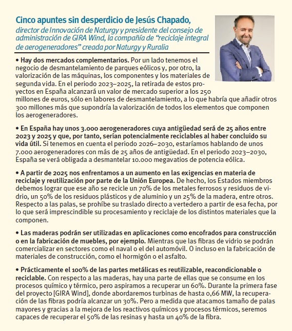 “Es una oportunidad global”, adelanta Jesús Chapado, el director de Innovación de Naturgy y presidente del consejo de administración de GIRA Wind, la compañía de “reciclaje integral de aerogeneradores” que han creado Naturgy y Ruralia. Sí, el reciclaje integral es una oportunidad global, porque las primeras hornadas de aerogeneradores están llegando, en los mercados más maduros (y España es uno de ellos), al final de su vida útil. O sea, que muy pronto va a haber muchas máquinas que reciclar. Y muchas palas. Muchísimas.