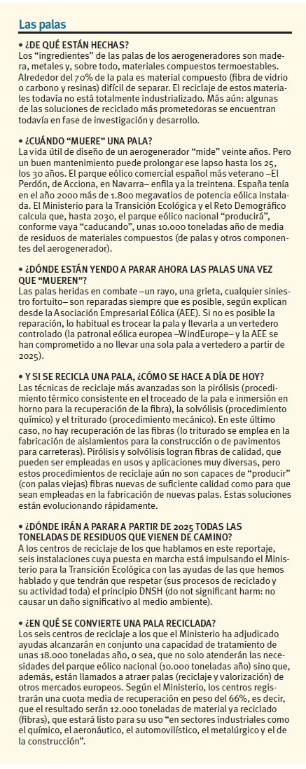 Acciona avanza en el desarrollo de su proyecto de planta (Waste2Fiber) en el municipio navarro de Lumbier, donde ya tiene una fábrica de palas. La compañía prevé una inversión de 15 millones de euros en esa instalación y va a recibir una ayuda de algo más de 5,2. Ahora mismo su departamento de Innovación está trabajando en un proyecto piloto de reciclaje: muelen las palas, hasta convertirlas en unas partículas lo suficientemente pequeñas como para que puedan componer, junto a una resina y una fibra de refuerzo, un nuevo material con el que la compañía ya está fabricando vigas estructurales para parques fotovoltaicos (sobre esas vigas, que vendrían a sustituir a las de acero habituales, se colocan las placas solares).