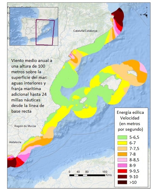 Cuatro son las zonas de alto potencial y una (y solo una) la de uso prioritario. Esta última se encuentra en las inmediaciones del Cabo de Creus (Girona). En total las cinco suman una superficie de 903,19 kilómetros cuadrados, lo que supone un 0,39% de la superficie de la demarcación. La distancia de esas zonas a la costa oscila entre los 3,1 y los 13 kilómetros. Las zonas con mejor recurso eólico quedan en los extremos: Cabo de Gata y Cabo de Creus. También destacan una zona más reducida al norte y al este del Delta del Ebro y la franja marina que discurre entre el noroeste y el sureste de la isla de Menorca.