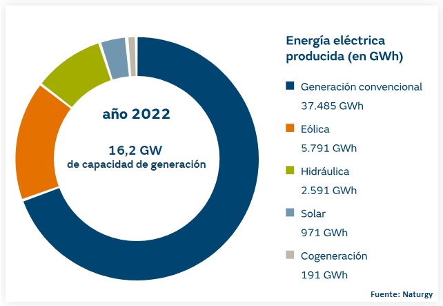 [Bajo estas líneas, a la derecha, la imagen detalla el mix de generación de Naturgy en 2022. La denominación "generación convencional" incluye la producción de electricidad en centrales de ciclo combinado que queman gas natural y en centrales nucleares. Fuente: Naturgy].