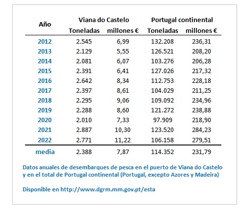 AEE quiere destacar en todo caso dos apuntes sobre el bienio 21-22. Uno: aunque el desembarque en el resto de Portugal continental también creció en 2021 (+6,7%), lo hizo mucho menos que en Viana do Castelo (+22%). Y dos: mientras que en el resto de Portugal la valoración económica de las capturas ha experimentado un descenso considerable respecto a 2021, en Viana do Castelo no solo no ha caído, sino que se incrementa, además también de manera considerable (véase nuevamente arriba la tabla).