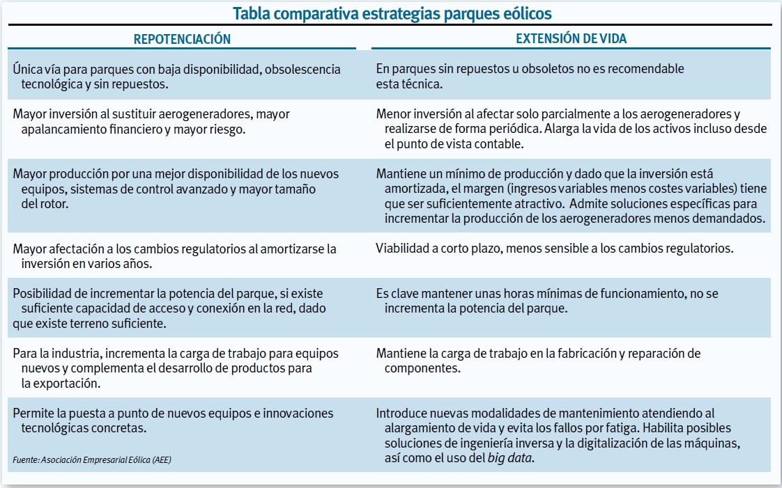 La extensión de vida, hoy en día, parece ser la tendencia más extendida en el sector, la que menores riesgos implica para los propietarios de los parques. Pero, en un futuro, la repotenciación será necesaria para seguir aprovechando aquellos emplazamientos con mayor recurso eólico, pudiendo generar, para un mismo emplazamiento con la misma potencia instalada, hasta el doble de energía que con el parque antiguo.