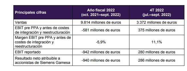 Entre octubre de 2021 y septiembre de 2022, Siemens Gamesa ha registrado ventas por valor de 9.814 millones de euros (-4% con respecto al mismo período del año anterior).