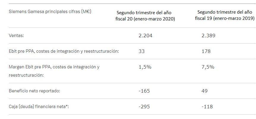 La compañía ha registrado pérdidas de 165 millones de euros en el trimestre, que ascienden a 339 millones de euros (M€) en el semestre, pero "la cartera de pedidos récord de 28.623 millones de euros (+21%) sustenta las buenas perspectivas a largo plazo". Esas serían las claves del primer balance trimestral que Siemens Gamesa presenta en tiempos de coronavirus: buenas expectativas en el largo plazo y pérdidas en el presente más inmediato: "el Covid-19 ha tenido un efecto negativo de 56 millones de euros en la rentabilidad y ha intensificado los retos que la compañía ha encontrado en la ralentización del mercado indio y en la ejecución de proyectos en el norte de Europa". La pandemia del Covid-19 también ha tenido su reflejo en las ventas y en la rentabilidad de la compañía. Entre enero y marzo, las ventas -reconoce la compañía- se han contraído un 8%, situándose en 2.204 millones de euros, impactadas por la menor venta de aerogeneradores. Las ventas semestrales se sitúan en 4.204 millones (-9,6%).