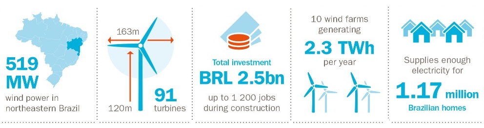 La compañía estima que la obra demandará una inversión total de 4.200 millones de coronas noruegas (unos 389 millones de euros) y tiene programada su conclusión para el mes de junio de 2023. La actividad comenzará en enero del año que viene, y Statkraft prevé para septiembre del año 2022 la entrada en operación de las primeras turbinas. Las máquinas Nordex que ha elegido la empresa estatal noruega son del modelo 163/5.7MW, el mayor aerogenerador terrestre empleado por la compañía nórdica hasta la fecha. "Con un diámetro de 163 metros -informa la empresa-, los rotores de estos aerogeneradores cubrirán un área equivalente a casi tres campos de fútbol". Según el director ejecutivo de Statkraft en Brasil, Fernando de Lapuerta, "una parte sustancial de la electricidad que va a producir el complejo ya ha sido adjudicada mediante subastas públicas y acuerdos comerciales en el mercado enegético libre brasileño".