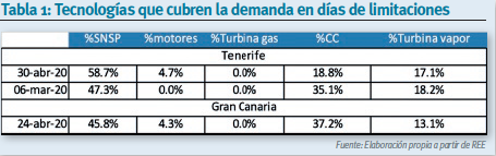 El 6 de marzo, y el 24 y 30 de abril, fueron unos de esos días en los que en Canarias se cerró el grifo a la generación eólica y solar (Tabla 1). Una energías, identificadas conjuntamente con la terminología SNSP (System Non Synchronus Penetration) e, insistimos, gratuitas, cuya reducción se compensó con combustibles líquidos, caro (a pesar del bajo precio actual) y contaminantes. Se desconoce qué llevó a decidir estas limitaciones pues a día de hoy no se publican las razones de las mismas (a pesar de lo regulado en los procedimientos de operación de REE ), ni si se plantearon posibles soluciones para reducirlas. Tampoco se sabe si las mismas podrían estar ligadas a las características operativas de las plantas que cubren los huecos térmicos o también a restricciones de red, pues las limitaciones no fueron uniformes para todos los parques.