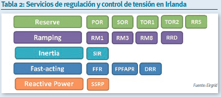 Los servicios POR, SOR, TOR1 y TOR2 recogidos en la citada tabla corresponden a los servicios españoles de primaria, secundaria y terciaria (con dos horizontes temporales), mientras que los RRD y RRS corresponden a la antigua gestión de desvíos, el primero desde potencia cero. El resto, Ramping e Inertia, corresponden a servicios de regulación potencia/frecuencia de respuesta rápida, mientras que el Fast-acting entran en el mismo servicio y en control de tensión, en régimen perturbado (FPFAPR) o permanente (DDR). Evidentemente, en el caso canario pudiera no ser necesario llegar a este nivel de desagregación, pero sí se podría evaluar la incorporación de algunos de estos servicios de acuerdo con las necesidades del sistema.