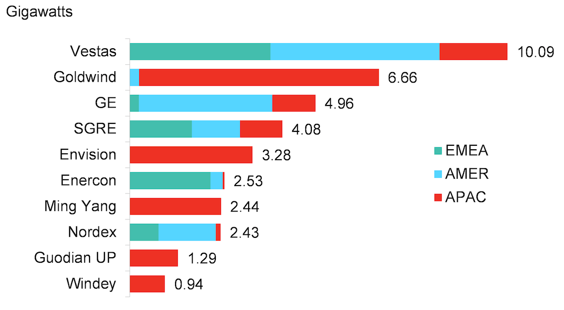 Goldwind pasó del tercer al segundo lugar, gracias a su buena posición en el mercado chino, donde se hizo con un tercio del mercado de 19,3 GW. La huella global de la compañía, sin embargo, sigue siendo limitada: solo el 5% de los 6,7GW de Goldwind fueron comisionados fuera de China. GE quedó en tercer lugar con 5 GW: seis de cada diez de sus turbinas tuvieron como escenario EEUU. Tanto GE como Vestas pusieron en marcha algo más de 3 GW en este país.