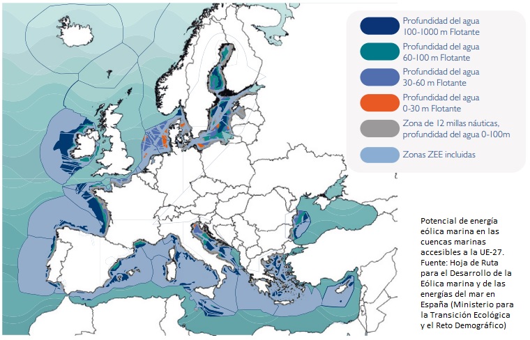 ● El perfil costero de España, con mucha profundidad a distancias muy cortas de la costa, hace imposible fijar las instalaciones eólicas al suelo marino.
