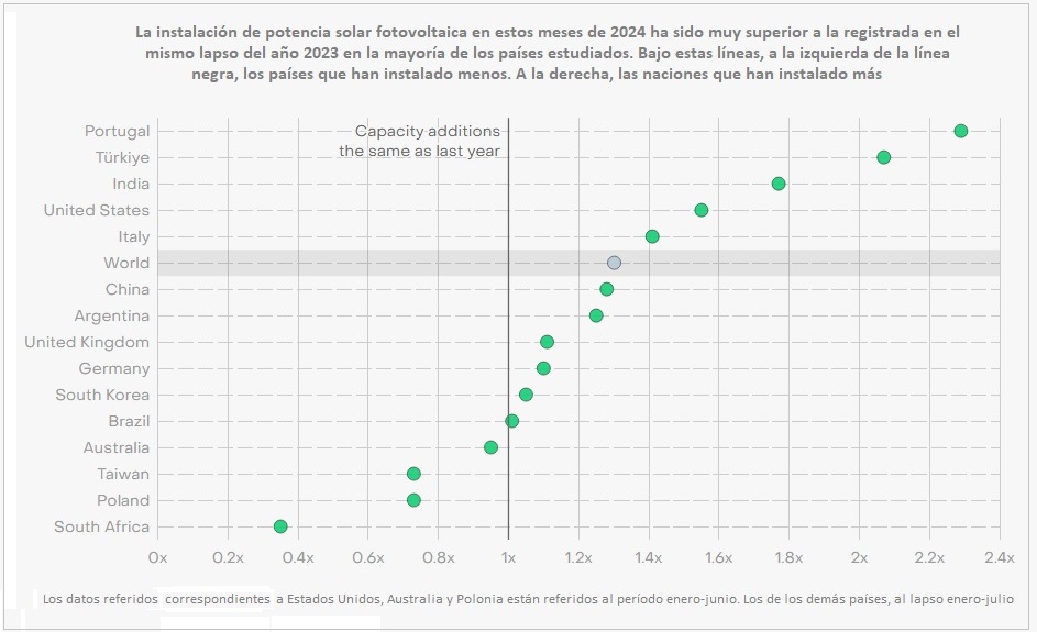 Portugal se dispara (ha instalado el doble en estos siete primeros meses del año; concretamente 2,3 veces más, como se aprecia en el gráfico que aparece bajo estas líneas, que en el mismo período del año pasado), pero ciertamente -reconoce Ember- es un mercado aún bastante pequeño en comparación con todos los citados hasta ahora (a finales de 2023, contaba con menos de 4.000 megavatios de potencia FV instalados).