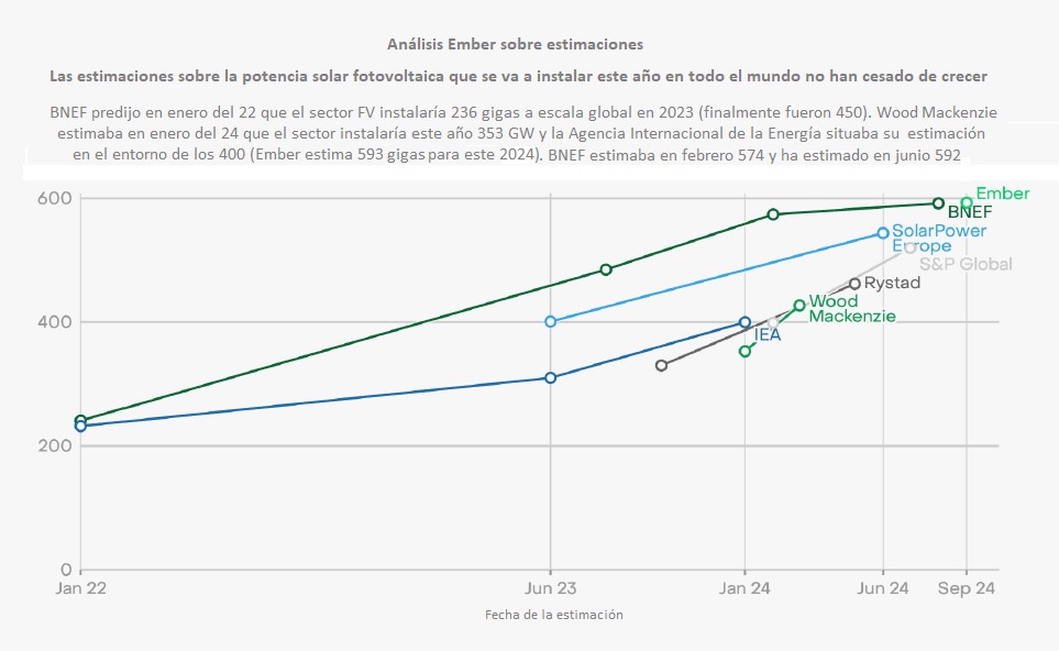 El informe de Ember pone como ejemplo la predicción de BNEF de enero de 2022. La prestigiosa consultora predijo entonces que el sector FV instalaría en 2023 a escala global 236 gigas. El error en la estimación (los 236 GW previstos por Bloomberg están muy lejos de los 450 finalmente registrados) condujo a BNEF a revisar al alza su previsión para 2024. SolarPower Europe, la patronal europea del sector, también ha ajustado sus previsiones: previó 401 gigas para el año 2024 allá por el mes de junio del 23, y ha elevado esa previsión (hasta los 544) en junio del corriente (junio de 2024).