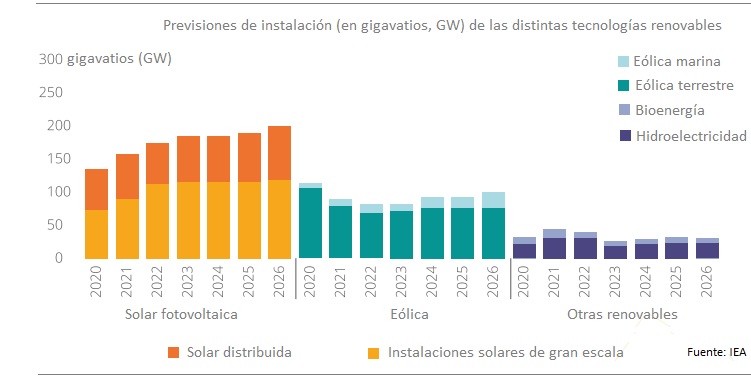 [Bajo estas líneas, a la derecha, previsiones de la Agencia Internacional de la Energía relativas a las distintas tecnologías renovables. Unidades expresadas en gigavatios (GWh). Como se aprecia en la imagen, el presente y el futuro inmediado del sector fotovoltaico son brillantes].