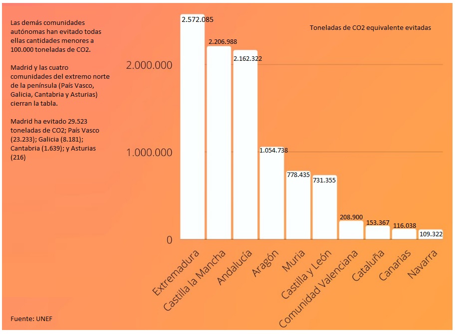 En este contexto, UNEF ha realizado un ranking de las Comunidades Autónomas que más toneladas de CO2 en 2022 han evitado gracias a la implementación de energía fotovoltaica en sus territorios. Son estas.