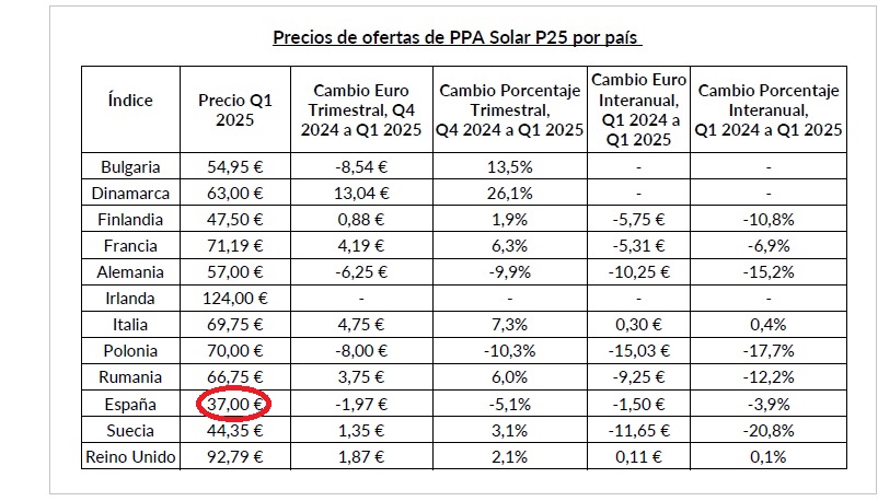 El dato es del último informe trimestral (PPA Price Index Report) de LevelTen Energy, la plataforma digital especializada en la elaboración de información mercantil, información muy demandada por responsables de compra de electricidad, vendedores, asesores, propietarios de activos y financieros del sector de las energías renovables. ¿Y los precios? Pues menos de 40 euros el megavatio hora en España (37 €/Mwh), 57 en Alemania, 69 en Italia, ó 92 en el Reino Unido. En fin, sin competencia.