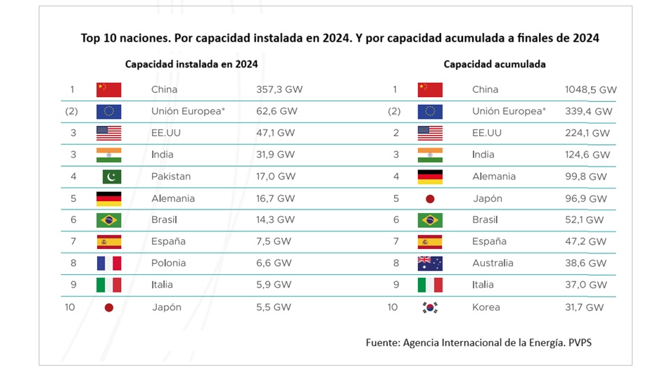 Y allí contamos muchas cosas. Como, por ejemplo, que el parque fotovoltaico global ha crecido en 2024 en casi 600 gigavatios de potencia (nunca antes instaló el sector solar FV tanto mega en 12 meses); o que el mundo ha incrementado su producción de electricidad solar en un 29% en 2024. O que Estonia ha sido el país que más vatios FV per capita ha instalado en 2024 (sí, Estonia). O que Brasil ha conectado este año pasado más potencia solar que la mismísima Alemania, o que Estados Unidos ha enchufado hasta 50 gigavatios.