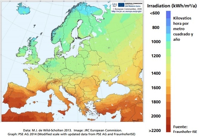 El año pasado, la producción de electricidad de origen fotovoltaico de Alemania quintuplicó a la española. Vamos, que Alemania produjo cinco veces más energía solar (un 500% más) que España, el país del Sol y playa. Según el prestigioso Fraunhofer Institute for Solar Energy Systems (Fraunhofer ISE), en 2019, el parque solar fotovoltaico alemán, que ronda los 50.000 megavatios de potencia instalada, produjo alrededor de 46,5 teravatios hora de energía eléctrica, el 8,2% del consumo bruto alemán de electricidad, lo cual supone mucha más energía en términos absolutos (más que España) y mucha más también en términos relativos. Porque, según las primeras estimaciones de Red Eléctrica de España (contenidas en su Avance del Informe del Sistema Eléctrico 2019), el parque nacional fotovoltaico español, que ha cerrado el año con 8.623 megavatios de potencia, produjo en 2019 poco más de 9,1 teravatios hora, el 3,5% de toda la electricidad generada aquí. El guarismo (3,5) es pírrico si lo comparamos con el que nos ha dejado en 2019 la nuclear, que el año pasado generó en España más del 22% de los kilovatios, o sencillamente ridículo, si tenemos en cuenta que la irradiación solar es en Alemania la mitad que en España (la irradiación es la densidad de energía solar recibida en un determinado periodo de tiempo y medida en vatios hora por metro cuadrado, o por metro cuadrado y día). En fin, que Alemania viene a tener la mitad de Sol que España y que produce cinco veces más electricidad con él (véase mapa de Fraunhofer ISE).