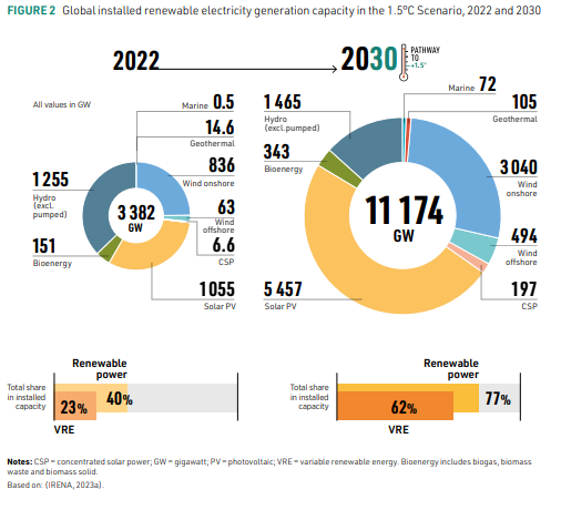 Para 2030, la capacidad total mundial instalada de generación de energía renovable tendría que multiplicarse por más de tres, pasando de los 3.382 gigavatios (GW) de 2022 a 11.174 GW. Según el informe presentado este lunes por la Presidencia de la COP28, la Agencia Internacional de Energías Renovables (Irena) y la Alianza Mundial de Energías Renovables (GRA), la capacidad solar fotovoltaica instalada a nivel mundial aumentaría a más de 5.400 GW (desde los 1.055 GW de 2022), y la eólica superaría los 3.500 GW (3040 GW en tierra y 500 GW en el mar), desde los 899 GW de 2022. El porcentaje de energías renovables en la generación de electricidad, por tanto, también cambiaría y pasaría del 10% de la electricidad total generada en 2021 al 46% en 2030. El tercer mayor aumento de la capacidad de generación correspondería a la energía hidroeléctrica; en 2030, la capacidad hidroeléctrica mundial instalada (excluida la energía hidroeléctrica de bombeo) crecería casi un 17% con respecto al nivel de 2022, alcanzando 1.465 GW.