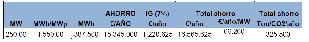 Para un total de 250 MW de nuevos parques solares FV a instalar, el ahorro que supondría para el sistema español sería el siguiente, según UNEF