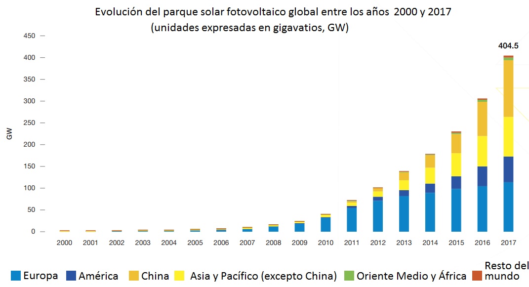 Según las primeras estimaciones, la instalación de nueva potencia mundial ha alcanzado en el año 2018 la cifra de 98 gigavatios (98.000 megavatios), con 44 GW correspondientes a China. Además, entre Estados Unidos, Japón e India suman 26 GW. El crecimiento mundial -señalan desde UNEF- se mantiene a un ritmo constante respecto al año anterior, donde se alcanzaron los 100 GW de nueva potencia, "lo que supone una clara apuesta por el desarrollo fotovoltaico como energía extendida que cada vez ocupa mayor cuota de penetración en el mix energético, todo ello en un contexto donde los objetivos de penetración de renovables apuntan a convertirse en la única fuente de energía eléctrica en un plazo de 25 a 30 años".
