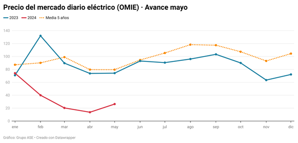 El perfil del precio horario actual ha cambiado por completo respecto a su promedio de los últimos siete años, con una reducción de los precios en las horas solares del 93,75%. Así, el precio diario del mercado mayorista español hasta el 20 de mayo se sitúa en sólo 26,30 euros por megavatio hora (€/MWh) que, aunque casi duplica el precio de abril, se trata del segundo mes de mayo más barato desde que hay registros, solo superado por los 21,25 €/MWh de mayo de 2020, en plena pandemia. En las horas solares (entre las 10:00 y las 19:00) el precio medio fue de sólo 3,91 €/MWh, mientras que en el resto de las horas, el promedio se sitúo cerca de los 40 €/MWh, con subidas hasta 63,44 €/MWh en las horas pico (21:00 horas).