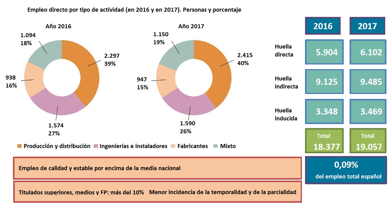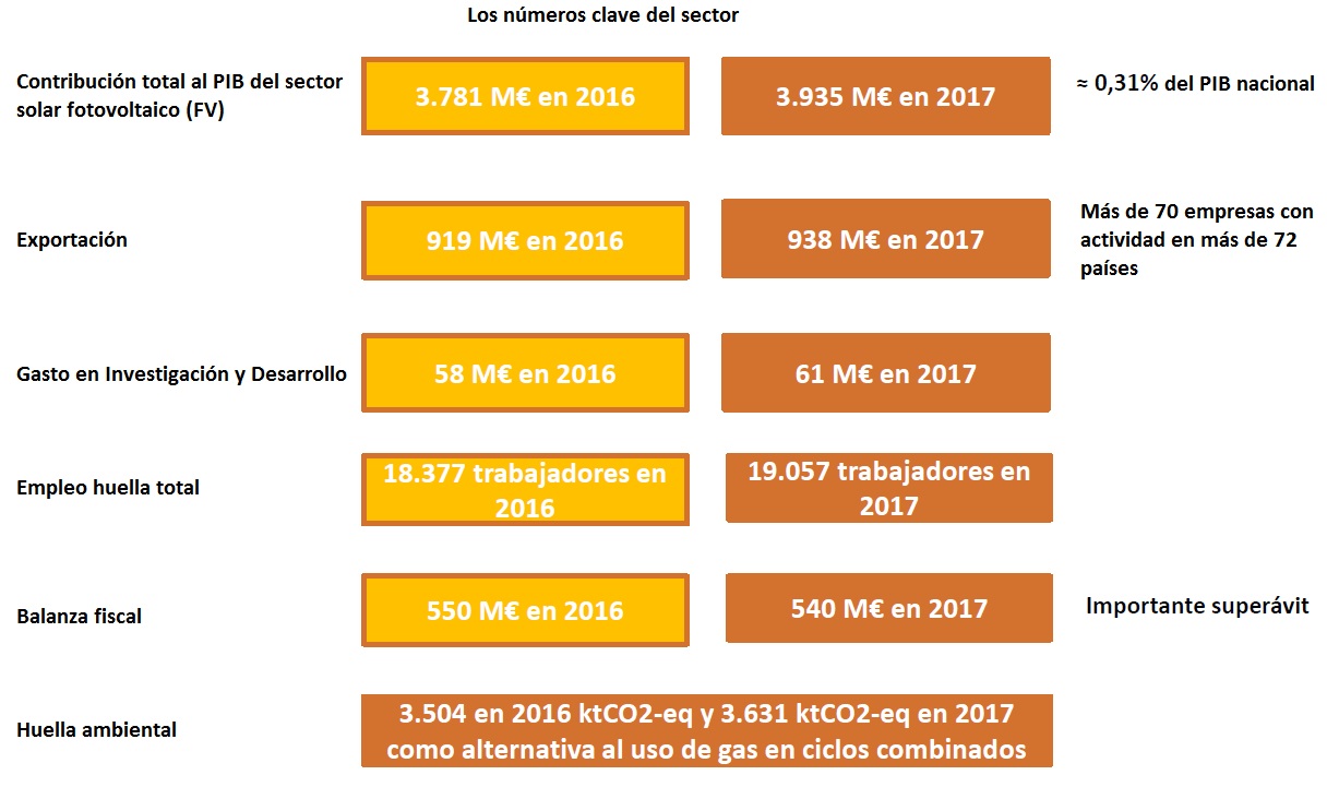 GEAR ha hecho un "Análisis del sector fotovoltaico en los ejercicios 2016 y 2017 en la triple dimensión de la sostenibilidad". A saber: a través del cálculo de (1) la huella económica, (2) la huella social, y (3) la huella ambiental, análisis del que bebe este informe anual de UNEF y que ayer presentó su coordinador, el profesor de la UCLM Jorge Zafrillas. Pues bien, según ese análisis, los principales datos macroeconómicos del sector FV en 2017 muestran "un crecimiento sustancial respecto al año 2016". A saber: la contribución total del sector fotovoltaico al PIB se sitúa en torno al 0,3% (3.935 millones de euros en 2017 y 3.781 millones de euros en 2016); las exportaciones del sector FV alcanzan la cifra de 938 millones de euros (919 millones de euros en 2016) y se estima que más de 70 empresas asociadas a UNEF tienen actividad en 72 países; la huella total de empleo arroja la cifra de más de 19.000 puestos de trabajo en 2017 (18.377 trabajadores en 2016); el gasto de las empresas españolas del sector en I+D+i fue de 60 millones de euros en 2016 y en 2017 un 2,5% más, lo que supone un 1,6% de su facturación, el doble de la media española situado en torno al 0,89%; y su actividad supone una reducción de emisiones estimadas en 3.631.000 toneladas de Co2.