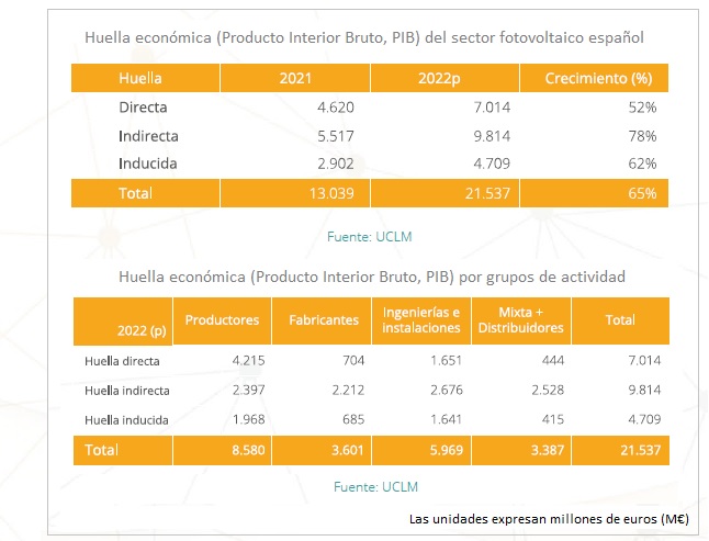 Los autores del Informe cuantifican la contribución de la fotovoltaica al "PIB íntegramente nacional". El sector -concreta la UCLM- generó 15.656 millones de euros, lo que supone un incremento del 60% con respecto a 2021.