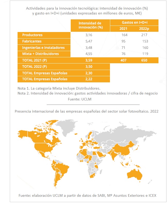Para competir en el escenario global las empresas españolas del sector fotovoltaico están haciendo un esfuerzo considerable en materia de Investigación, Desarrollo e innovación. El Informe UNEF 2023 destaca en ese sentido el "notorio crecimiento" de la I+D+i en los últimos años. "En 2022 -concreta el anuario-, el gasto en I+D+I ascendió a 650 milones de euros, un 60% más que el año anterior, cuando se alcanzaron los 407 millones". UNEF resalta particularmente "el compromiso de las empresas fabricantes, que destinaron el 5,47% de sus ingresos a actividades de innovación tecnológica, alcanzando una cifra de 153 millones de euros en el año 2022". En resumen -explican los autores del informe-, la intensidad en innovación del sector de la energía fotovoltaica en su conjunto (3,5%) sobresale en relación a la media de las empresas españolas (2,3%) y por encima del promedio de la industria nacional (2,2%).