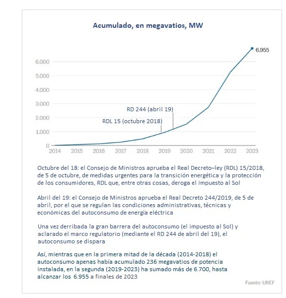 [Bajo estas líneas, a la derecha, evolución del autoconsumo a lo largo de los últimos diez años. Como se aprecia en la imagen, tras la derogación del impuesto al Sol (octubre del 18) y la aprobación del primer RD de Autoconsumo (abril del 19), el mercado se dispara hasta 2022, año en que toca techo (con la instalación en esos doce meses de hasta 2.500 megavatios de potencia en autoconsumos). El frenesí de esos años queda matizado en 2023, curso en el que el mercado cae un 30% con respecto al año top 2022 (el sector instala en 2023 aproximadamente 2.000 megas].