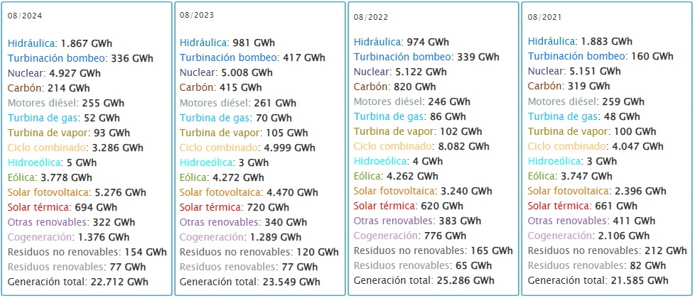 Todos los datos han sido extraídos de REData, página de información oficial de Red Eléctrica (REE), que es el operador del sistema eléctrico nacional. Los datos, catalogados por REE como provisionales, están pendientes de ajuste definitivo.