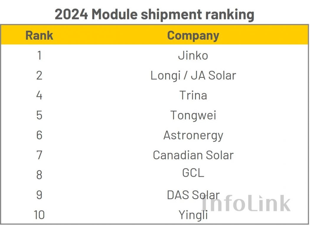 En comparación con los fabricantes que se encuentran detrás, existe una brecha significativa en los volúmenes de envío de más del 30%, unos 10 GW. [La tabla muestra la clasificación de empresas que más módulos enviaron en 2024]