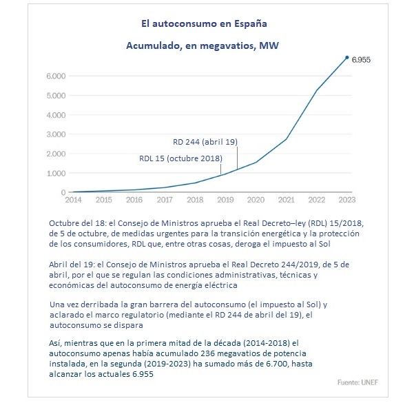 El Plan Nacional Integrado de Energía y Clima de España prevé que el autoconsumo (energía solar autogenerada y autoconsumida en instalaciones residenciales, comerciales e industriales) alcance los 19 GW en 2030, es decir, que el país debe instalar 12 gigas en los próximos seis años, pues ahora mismo habría aquí en torno a 7 gigavatios de autoconsumos.