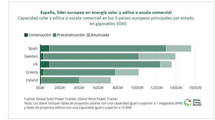 España tiene la mayor cartera de proyectos de energías renovables a escala comercial en desarrollo de Europa, encabezados por los de energía solar a escala comercial, cuya capacidad prevista (113,9 GW) supera a la de los tres países siguientes juntos.