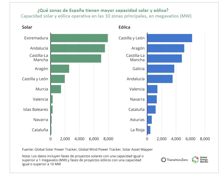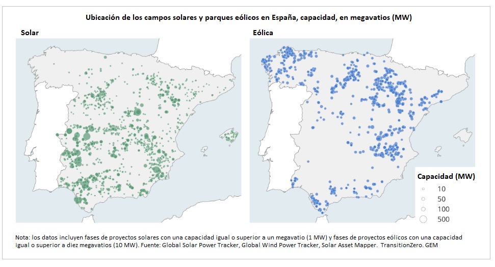 Los proyectos solares y eólicos a escala comercial están muy repartidos por todo el territorio español. Dadas las características geográficas del país, el norte de España cuenta con la mayoría de los proyectos eólicos operativos y potenciales (en regiones como Aragón, Galicia y Castilla y León), mientras que los proyectos solares están más concentrados en zonas del sur y del centro (como Extremadura, Andalucía y Castilla-La Mancha). [Bajo estas líneas, el Plan Nacional Integrado de Energía y Clima de España 2030, tal cual está ahora].