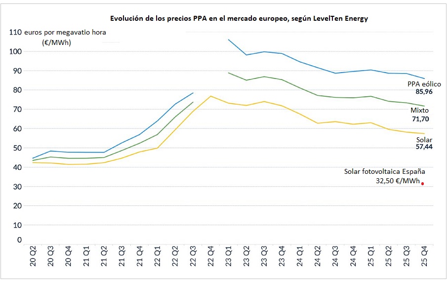 La demanda de acuerdos PPA de compra de electricidad de origen renovable continúa firme, porque la industria se ha dado cuenta de que puede utilizar estos contratos (de largo plazo y precio fijo) como herramientas efectivas para fijar los precios de la electricidad a 2, 5, 10, 15 ó 20 años vista, y evitar así sorpresas (pandemias, problemas logísticos de escala global, tensiones geopolíticas, guerras...). Además, contratar un suministro de electricidad limpia (de origen renovable) beneficia a la marca contratante, en términos de imagen, de cara al público. LevelTen, plataforma digital para compradores, vendedores, asesores, propietarios de activos y financieros de energías renovables, ha publicado hoy su último informe sobre el particular (el PPA Price Index del cuarto trimestre de 2025), que hace un seguimiento de la evolución de los precios de las energías limpias en 20 países europeos, utilizando índices de precios basados en las ofertas de PPA subidas a LevelTen Energy Marketplace por los desarrolladores de proyectos eólicos y solares.