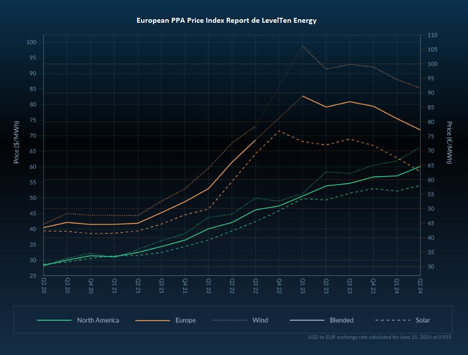 [Bajo estas líneas, infografía LevelTen que muestra cómo el precio medio en el segundo trimestre de 2024 para el megavatio hora solar en Europa ronda los 65 euros, muy por encima del precio español. El megavatio hora en productos híbridos (contratos de compraventa de electricidad eólica y fotovoltaica) supera los 75 euros. Y el megavatio hora en PPAs eólicos escala por encima de los 90. Los precios de los PPAs en Norteamérica están por encima de los europeos (LevelTen también analiza periódicamente los PPAs de ese mercado).
