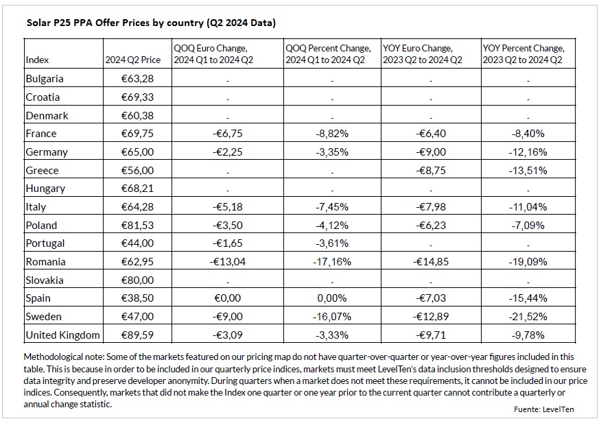 El índice de precios PPA LevelTen Europa correspondiente al segundo trimestre (T4) de 2024 ha analizado datos de 448 precios ofertados por 285 proyectos de energías renovables en 24 países europeos.