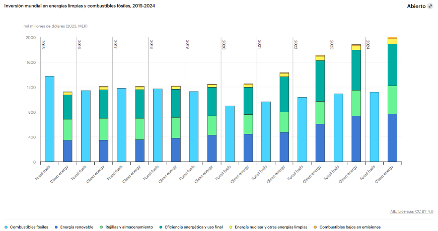 El mundo invierte ahora casi el doble en energía limpia que en combustibles fósiles, destacando la inversión en energía solar fotovoltaica por encima de todas las demás tecnologías de generación combinadas, que podría superar los 500 mil millones de dólares en 2024. Estas inversiones al alza hacen que la inversión en energías renovables alcance los 2 billones de dólares de un total en energía que superará los 3 billones por primera vez en 2024 según las previsiones. El gasto en energía renovable, redes y almacenamiento es ahora mayor que el gasto total en petróleo, gas y carbón, y las presiones en la cadena de suministro y la caída de los precios han aliviado los costes de, por ejemplo, paneles solares (se abaratan un 30% en los últimos dos años), y las materias primas, especialmente las necesarias para las baterías. Así se desprende del último informe ´World Energy Investment 2024` publicado este jueves por la International Energy Agency (IEA).