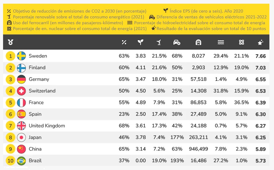 (1) sobre las "políticas ambientales" (en esta categoría, donde los autores del informe han analizado hasta trece instrumentos ambientales, las tres naciones que ocupan los tres cajones del podio son Francia, Suiza y Luxemburgo; España no entra en el Top 10);