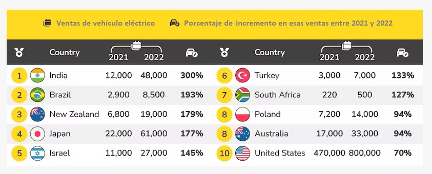 (6) naciones que han registrado los mayores incrementos de ventas de vehículo eléctrico entre 2021 y 2022 (India: +300%; Brasil: +193%; y Nueva Zelanda, +179%);