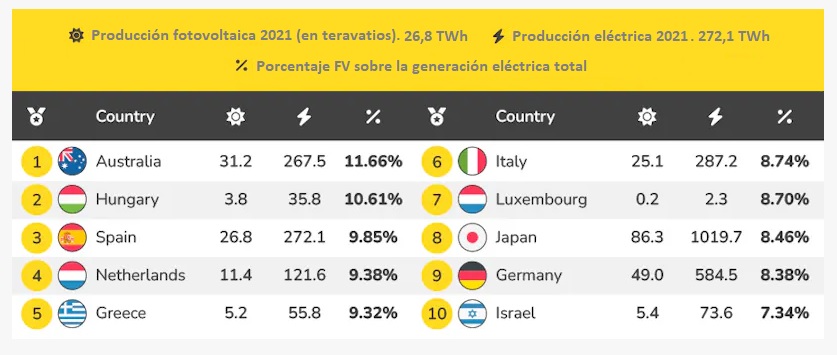 (3) el porcentaje de energía solar fotovoltaica sobre el mix eléctrico (Australia, Hungría y España);