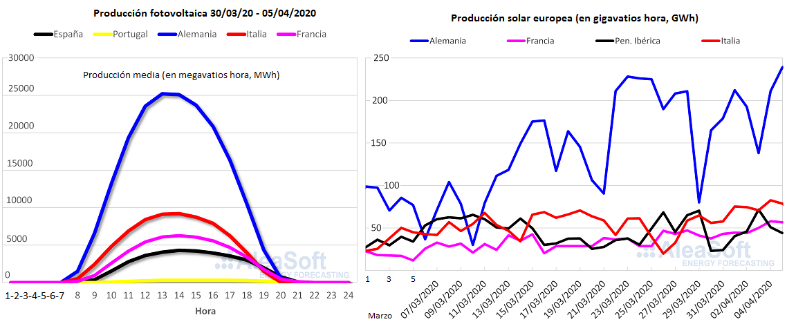 [Abajo, dos gráficos extraídos del último boletín de AleaSoft. En el de la derecha puede apreciarse cómo el día 5 de abril, domingo, el parque solar fotovoltaico nacional alemán produjo más electricidad que todos los parques FV de España, Portugal, Italia y Francia juntos].