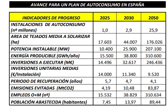 El Observatorio de la Sostenibilidad estima que el millón de tejados solares de España podría estar en marcha en 2025. Los autores del informe han trabajado con una inversión de 14.500 millones de euros, inversión "de origen público-privado, calculando una estimación generosa de unos 14.000 euros por instalación". El período de recuperación de la inversión estaría por debajo de los seis años (5,7). Es decir, que, si un particular que paga 100 euros de electricidad en cada factura monta una instalación solar para autoconsumo sobre el tejado de su casa y esa instalación le produce un 40% de la electricidad que usa, con esos 40 euros que se ahorra en cada factura irá pagando el crédito durante los seis primeros años (ó 5,7, si queremos ser más precisos), y, a partir del sexto año, todo lo que ahorre será neto, es decir, que, a partir del sexto año, cada factura le saldrá por 60 euros.