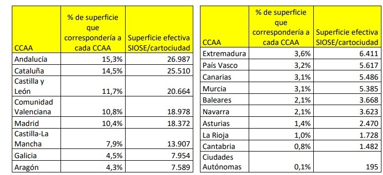 Según los autores del estudio, el cálculo preliminar de las superficies todavía debe de ser matizado con otras fuentes de información, pero en todo caso da una dimensión de proyecto. El Observatorio ha calculado la superficie disponible a partir del Sistema de Información de Ocupación del Suelo de España (Siose), que determina 124 categorías de ocupación del suelo, y de las imágenes más recientes disponibles del Plan Nacional de Ortofotografía Aérea (PNOA), productos ambos generados por el Instituto Geográfico Nacional (IGN) con detalle de 35 centímetros. La superficie ha sido acotada por bloqueos solares y otros criterios. Una vez recabada toda esa información, los autores -insisten- han preferido ser conservadores.