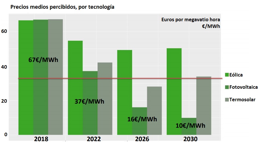 Los precios medios caen, pero no caen de manera catastrófica: los precios percibidos por las distintas tecnologías de generación [eólica, termosolar y fotovoltaica]. Los precios medios percibidos por la fotovoltaica van a ir cayendo a medida que vayamos transitando hacia 2030, según este modelo, y de nuevo -insisto- todo se puede hacer con mayor nivel de detalle. Como ordenes de magnitud en 2030 el precio medio percibido por la fotovoltaica en el mercado actual va a estar en torno a los ocho, diez euros el megavatio hora. ¿Por qué? Pues porque precisamente cuando la fotovoltaica produce es cuando su efecto depresor de precio es mayor.