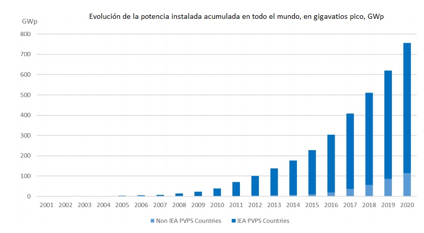 La Agencia Internacional de la Energía acaba de publicar su última Fotografía (Snapshot report) del sector fotovoltaico mundial. Según esa instantánea, el parque FV global tiene ahora mismo una potencia total acumulada de unos 760.400 megavatios (MW). En los doce meses de 2020, el mundo ha instalado nada más y nada menos que 139.000 megavas de nueva potencia solar fotovoltaica (FV). Al menos veinte países añadieron el año pasado a sus respectivos parques nacionales más de mil megavatios FV de nueva potencia. Catorce países tienen hoy más de 10.000 megas FV conectados a sus redes nacionales respectivas; cinco, más de 40.000 (China, Estados Unidos, la minúscula Japón, Alemania e India). China lidera el escalafón global (con 253.400 megavatios), muy-muy-muy por encima, en el podio, de sus dos más "inmediatos" perseguidores: Estados Unidos, 93,2; y Japón, 71,4.