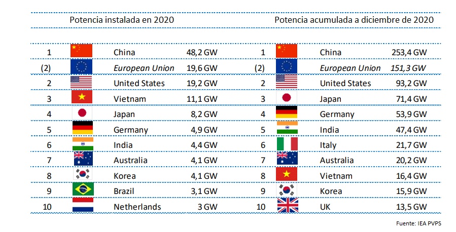 Tras dos años de contracción, el mercado chino ha vuelto a crecer, hasta los 48.200 megavatios de nueva potencia instalada en 2020. Ese formidable guarismo representa el 35% de la potencia mundial instalada en el año del Covid. Tras el gigante asiático, se ubica la Unión Europea, colectivo de 27 pequeñas naciones que han sumado 19.600 megavatios FV. Estados Unidos queda en tercer lugar, con 19.200. Un país minúsculo del sureste asiático, Vietnam, se ha apuntado 11.000 megas, más del doble que Alemania.